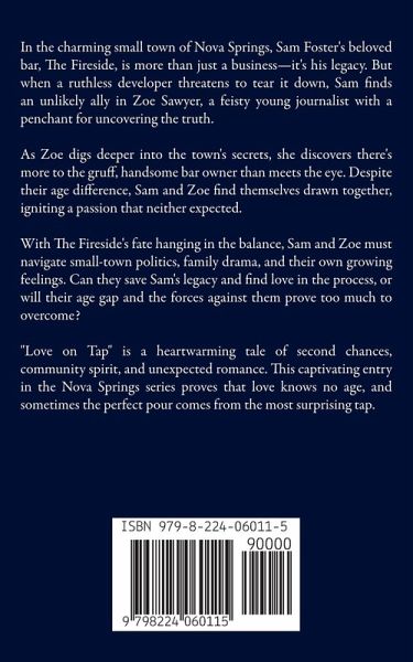 In the charming small town of Nova Springs, Sam Foster's beloved bar, The Fireside, is more than just a business-it's his legacy. But when a ruthless developer threatens to tear it down, Sam finds an unlikely ally in Zoe Sawyer, a feisty young journalist with a penchant for uncovering the truth. As Zoe digs deeper into the town's secrets, she discovers there's more to the gruff, handsome bar owner than meets the eye. Despite their age difference, Sam and Zoe find themselves drawn together, igniting a passion that neither expected. With The Fireside's fate hanging in the balance, Sam and Zoe must navigate small-town politics, family drama, and their own growing feelings. Can they save Sam's legacy and find love in the process, or will their age gap and the forces against them prove too much to overcome? "Love on Tap" is a heartwarming tale of second chances, community spirit, and unexpected romance. This captivating entry in the Nova Springs series proves that love knows no age, and sometimes the perfect pour comes from the most surprising tap.