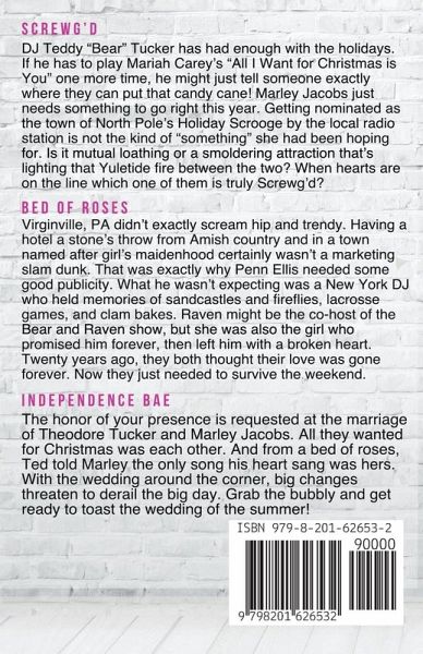 SCREWG'D DJ Teddy "Bear" Tucker has had enough with the holidays. If he has to play Mariah Carey's "All I Want for Christmas is You" one more time, he might just tell someone exactly where they can put that candy cane! Marley Jacobs just needs something to go right this year. Getting nominated as the town of North Pole's Holiday Scrooge by the local radio station is not the kind of "something" she had been hoping for. Is it mutual loathing or a smoldering attraction that's lighting that Yuletide fire between the two? When hearts are on the line which one of them is truly Screwg'd? BED OF ROSES Virginville, PA didn't exactly scream hip and trendy. Having a hotel a stone's throw from Amish country and in a town named after girl's maidenhood certainly wasn't a marketing slam dunk. That was exactly why Penn Ellis needed some good publicity. What he wasn't expecting was a New York DJ who held memories of sandcastles and fireflies, lacrosse games, and clam bakes. Raven might be the co-host of the Bear and Raven show, but she was also the girl who promised him forever, then left him with a broken heart. Twenty years ago, they both thought their love was gone forever. Now they just needed to survive the weekend. INDEPENDENCE BAE The honor of your presence is requested at the marriage of Theodore Tucker and Marley Jacobs. All they wanted for Christmas was each other. And from a bed of roses, Ted told Marley the only song his heart sang was hers. With the wedding around the corner, big changes threaten to derail the big day. Grab the bubbly and get ready to toast the wedding of the summer!