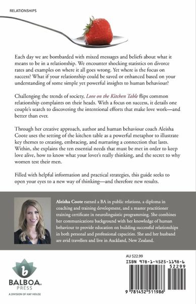 Each day we are bombarded with mixed messages and beliefs about what it means to be in a relationship. We encounter shocking statistics on divorce rates and examples on where it all goes wrong. Yet where is the focus on success? What if your relationship could be saved or enhanced based on your understanding of some simple yet powerful insights to human behaviour? Challenging the trends of society, Love on the Kitchen Table flips common relationship complaints on their heads. With a focus on success, it details one couple¿s search to discovering the intentional efforts that make love work¿and better than ever. Through her creative approach, author and human behaviour coach Aleisha Coote uses the setting of the kitchen table as a powerful metaphor to illustrate key themes to creating, embracing, and nurturing a connection that lasts. Within, she explains the ten essential needs that must be met in order to keep love alive, how to know what your lover¿s really thinking, and the secret to why women test their men. Filled with helpful information and practical strategies, this guide seeks to open your eyes to a new way of thinking¿and therefore new results.