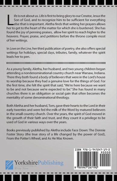 Life is not about us. Life is first to bring glory to our Creator, Jesus the Son of God, and to recognize him to be sufficient for everything else that is important. Aletha finds that writing her prayers allows her to get to the heart of the matter for which she is burdened. She has found the joy of penning praises, allow her spirit to reach higher to the heavens. Prayer, praise, and petitions before the throne compile most of her writings.