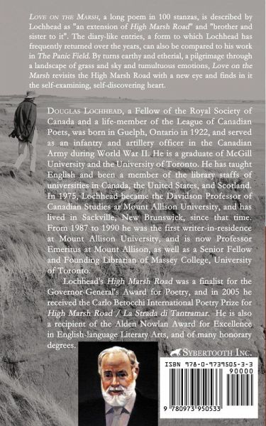 Love on the Marsh, a long poem in 100 stanzas, is described by Lochhead as "an extension of High Marsh Road" and "brother and sister to it". The diary-like entries, a form to which Lochhead has frequently returned over the years, can also be compared to his work in The Panic Field. By turns earthy and etherial, a pilgrimage through a landscape of grass and sky and tumultuous emotions, Love on the Marsh revisits the High Marsh Road with a new eye and finds in it the self-examining, self-discovering heart. Douglas Lochhead, a Fellow of the Royal Society of Canada and a life-member of the League of Canadian Poets, was born in Guelph, Ontario in 1922, and served as an infantry and artillery officer in the Canadian Army during World War II. Lochhead's High Marsh Road was a finalist for the Governor-General's Award for Poetry, and in 2005 he received the Carlo Betocchi International Poetry Prize for High Marsh Road / La Strada di Tantramar. He is also a recipient of the Alden Nowlan Award for Excellence in English-language Literary Arts, and of many honorary degrees.