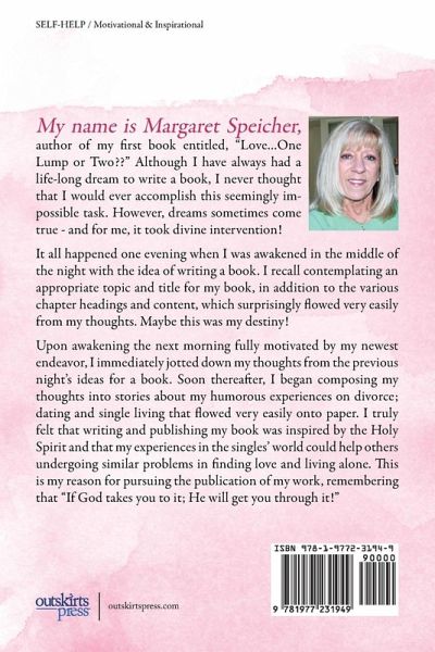 My name is Margaret Speicher, author of my first book entitled, "Love...One Lump or Two??" Although I have always had a life-long dream to write a book, I never thought that I would ever accomplish this seemingly impossible task. However, dreams sometimes come true - and for me, it took divine intervention! It all happened one evening when I was awakened in the middle of the night with the idea of writing a book. I recall contemplating an appropriate topic and title for my book, in addition to the various chapter headings and content, which surprisingly flowed very easily from my thoughts. Maybe this was my destiny! Upon awakening the next morning fully motivated by my newest endeavor, I immediately jotted down my thoughts from the previous night's ideas for a book and began composing my thoughts onto paper. Thus, an inspiring story developed about my humorous and entertaining challenges and opportunities (bumps) that this determined blonde with a definite sense of humor and temporary misguided sense of direction from a recent divorce encountered. In passionate pursuit for my soul mate, "Mr. Right", my journey began with the chapter on "The Date from Hell" involving many unforeseen happenings on an attention-grabbing double date through the chapter on "Dating 101" describing fresh ideas and methods of surviving the singles' scene and meeting suitable men and more leading to "Mr. Wonderful", my perceived soul mate from God - or was he? I truly felt that writing and publishing this inspiring and entertaining book was inspired by the Holy Spirit and that my experiences and determination in the singles' world could help others undergoing similar problems in finding love and living alone. This is my reason for pursuing the publication of my work, remembering that "If God takes you to it; He will get you through it!"