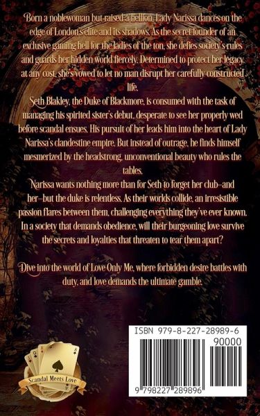 Born a noblewoman but raised a hellion, Lady Narissa dances on the edge of London's elite and its shadows. As the secret founder of an exclusive gaming hell for the ladies of the ton, she defies society's rules and guards her hidden world fiercely. Determined to protect her legacy at any cost, she's vowed to let no man disrupt her carefully constructed life. Seth Blakley, the Duke of Blackmore, is consumed with the task of managing his spirited sister's debut, desperate to see her properly wed before scandal ensues. His pursuit of her leads him into the heart of Lady Narissa's clandestine empire. But instead of outrage, he finds himself mesmerized by the headstrong, unconventional beauty who rules the tables. Narissa wants nothing more than for Seth to forget her club-and her-but the duke is relentless. As their worlds collide, an irresistible passion flares between them, challenging everything they've ever known. In a society that demands obedience, will their burgeoning love survive the secrets and loyalties that threaten to tear them apart? Dive into the world of Love Only Me, where forbidden desire battles with duty, and love demands the ultimate gamble.