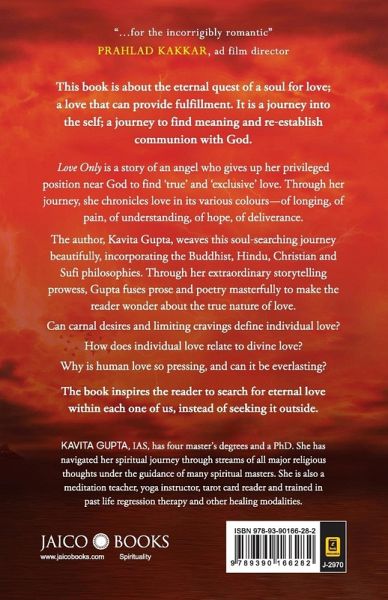 This book is about the eternal quest of a soul for love; a love that can provide fulfillment. It is a journey into the self; a journey to find meaning and re-establish communion with God. Love Only is a story of an angel who gives up her privileged position near God to find 'true' and 'exclusive' love. Through her journey, she chronicles love in its various colours-of longing, of pain, of understanding, of hope, of deliverance. The author, Kavita Gupta, weaves this soul-searching journey beautifully, incorporating the Buddhist, Hindu, Christian and Sufi philosophies. Through her extraordinary storytelling prowess, Gupta fuses prose and poetry masterfully to make the reader wonder about the true nature of love. Can carnal desires and limiting cravings define individual love? How does individual love relate to divine love? Why is human love so pressing, and can it be everlasting? The book inspires the reader to search for eternal love within each one of us, instead of seeking it outside. KAVITA GUPTA, IAS, has four master's degrees and a PhD. She has navigated her spiritual journey through streams of all major religious thoughts under the guidance of many spiritual masters. She is also a meditation teacher, yoga instructor, tarot card reader and trained in past life regression therapy and other healing modalities. "A story that weaves through otherworldly wilderness" AMISH TRIPATHI, bestselling author "...for the incorrigibly romantic" PRAHLAD KAKKAR, ad film director""