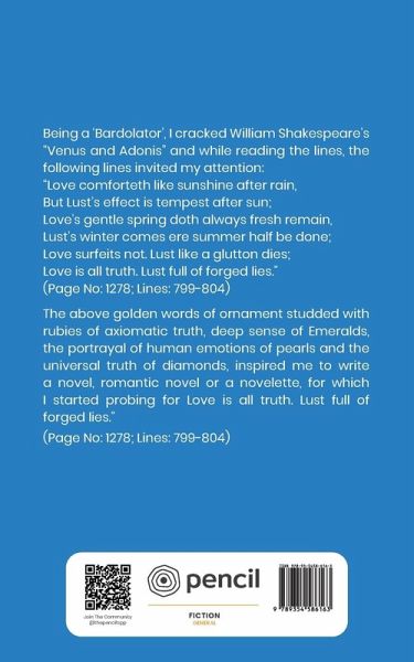 Being a 'Bardolator', I cracked William Shakespeare's "Venus and Adonis" and while reading the lines, the following lines invited my attention: "Love comforteth like sunshine after rain, But Lust's effect is tempest after sun; Love's gentle spring doth always fresh remain, Lust's winter comes ere summer half be done; Love surfeits not. Lust like a glutton dies; Love is all truth. Lust full of forged lies." (Page No: 1278; Lines: 799-804) The above golden words of ornament studded with rubies of axiomatic truth, deep sense of Emeralds, the portrayal of human emotions of pearls and the universal truth of diamonds, inspired me to write a novel, romantic novel or a novelette, for which I started probing for Love is all truth. Lust full of forged lies." (Page No: 1278; Lines: 799-804)