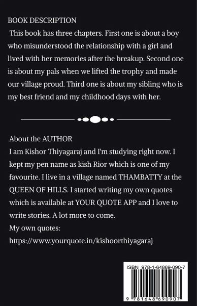 This book has three chapters. First one is about a boy who misunderstood the relationship with a girl and lived with her memories after the breakup. Second one is about my pals when we lifted the trophy and made our village proud. Third one is about my sibling who is my best friend and my childhood days with her.