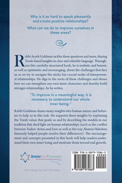Why is it so hard to speak pleasantly and create positive relationships? What can we do to improve ourselves in these areas? Rabbi Aryeh Goldman tackles these questions and more, sharing Torah-based insights in clear and relatable language. Throughout this carefully structured book, he is realistic and honest, as well as optimistic and encouraging, about the challenges that face us as we try to navigate the sticky but crucial realm of interpersonal relationships. He digs to the roots of these challenges and shows how we can strengthen our own inner characters and thereby build stronger relationships. As he writes, "To improve in a meaningful way, it is necessary to understand our whole inner being." Rabbi Goldman shares many insights into human nature and behavior to help us in this task. He supports these insights by explaining the Torah values that guide us and by describing the models in our tradition that shed light on human relationships (such as the conflict between Yaakov Avinu and Esav as well as the way Aharon Hakohen famously helped people resolve their differences). The encouragement and concepts presented in this book will help readers understand their own inner being and motivate them toward real growth.