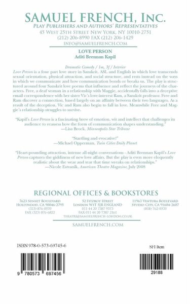 Love Person is a four part love story in Sanskrit, ASL and English in which love transcends sexual orientation, physical attraction, and social structure and rests instead on the ways in which we communicate and how communication bonds or breaks us. The play is structured around four Sanskrit love poems that influence and reflect the journeys of the characters. Free, a Deaf woman in a relationship with Maggie, accidentally falls into a deceptive email correspondence with her sister Vics love interest Ram, a Sanskrit professor. Free and Ram discover a connection, based largely on an affinity between their two languages. As a result of the deception, Vic and Ram also begin to fall in love. Meanwhile Free and Maggies relationship struggles to survive.