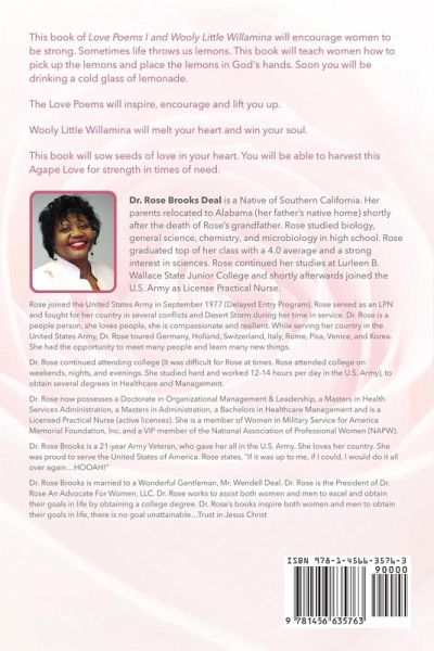 LOVE POEMS I and WOOLY LITTLE WILLAMINA This book of Love Poems I and Wooly Little Willaminia will encourage women to be strong. Sometimes life throws us lemons. Women must learn to be strong. This book will assist women in learning how to pick the lemons up and, place them in the hands of God. Soon you will be drinking a cold glass of lemonade. The Love Poems will inspire, encourage and lift you up. The Love Poems will sow seeds of love in your heart. The world can harvest this Agape Love in a time as we live in today. This book will melt your heart and win your soul. Dr. Rose
