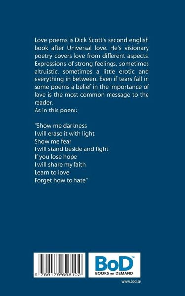 Love poems is Dick Scott's second english book after Universal love. He's visionary poetry covers love from different aspects. Expressions of strong feelings, sometimes altruistic, sometimes a little erotic and everything in between. Even if tears fall in some poems a belief in the importance of love is the most common message to the reader.As in this poem:"Show me darknessI will erase it with lightShow me fearI will stand beside and fightIf you lose hope I will share my faithLearn to loveForget how to hate"