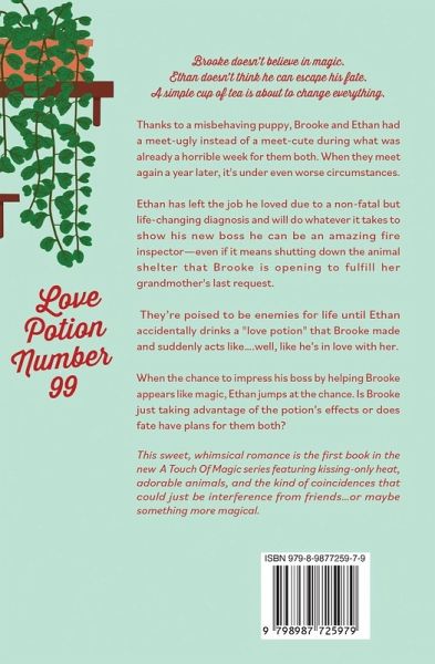 Brooke doesn't believe in magic. Ethan doesn't think he can escape his fate. A simple cup of tea is about to change everything. Thanks to a misbehaving puppy, Brooke and Ethan had a meet-ugly instead of a meet-cute during what was already a horrible week for them both. When they meet again a year later, it's under even worse circumstances. Ethan has left the job he loved due to a non-fatal but life-changing diagnosis and will do whatever it takes to show his new boss he can be an amazing fire inspector-even if it means shutting down the animal shelter that Brooke is opening to fulfill her grandmother's last request. They're poised to be enemies for life until Ethan accidentally drinks a "love potion" that Brooke made and suddenly acts like....well, like he's in love with her. When the chance to impress his boss by helping Brooke appears like magic, Ethan jumps at the chance. Is Brooke just taking advantage of the potion's effects or does fate have plans for them both? This sweet, whimsical romance is the first book in the new A Touch Of Magic series featuring kissing-only heat, adorable animals, and the kind of coincidences that could just be interference from friends...or maybe something more magical.