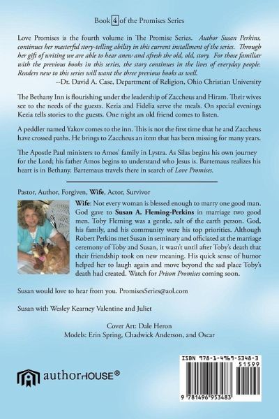 Love Promises is the fourth volume in The Promise Series. Author Susan Perkins, continues her masterful story-telling ability in this current installment of the series. Through her gift of writing we are able to hear anew and afresh the old, old, story. For those familiar with the previous books in this series, the story continues in the lives of everyday people. Readers new to this series will want the three previous books as well. --Dr. David A. Case, Department of Religion, Ohio Christian University The Bethany Inn is flourishing under the leadership of Zaccheus and Hiram. Their wives see to the needs of the guests. Kezia and Fidelia serve the meals. On special evenings Kezia tells stories to the guests. One night an old friend comes to listen. A peddler named Yakov comes to the inn. This is not the first time that he and Zaccheus have crossed paths. He brings to Zaccheus an item that has been missing for many years. The Apostle Paul ministers to Amos' family in Lystra. As Silas begins his own journey for the Lord; his father Amos begins to understand who Jesus is. Bartemaus realizes his heart is in Bethany. Bartemaus travels there in search of Love Promises.