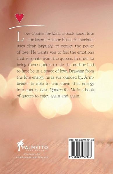Love Quotes for Me is a book about love for lovers. Author Brent Armbrister uses everyday words to convey the power of love. He wants you to feel the emotions that are in the quotes. In order to bring these quotes to life the author had to first be in a space of love. Drawing from the love energy he is surrounded by, Armbrister is able to transform that energy into quotes. Love Quotes for Me is a book of quotes to enjoy again and again.