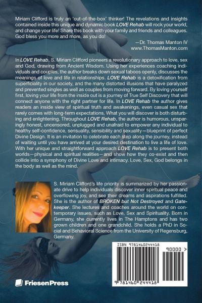 In LOVE Rehab, S. Miriam Clifford pioneers a revolutionary approach to love, sex and God, drawing from Ancient Wisdom. Using her experiences coaching individuals and couples, the author breaks down sexual taboos openly, discusses the meanings of love and life in relationships. LOVE Rehab is a detoxification from superficiality in our society, and the many distorted illusions that have paralyzed and prevented singles as well as couples from moving forward. By loving yourself first, loving your life from the inside out is a journey of True Self Discovery that will connect anyone with the right partner for life. In LOVE Rehab the author gives readers an inside view of spiritual truth and awakenings, even casual sex that rarely comes with long-term expectations. What you will discover is both disturbing and enlightening. Throughout LOVE Rehab, the author is humorous, unsparingly honest, uncensored, unplugged and unafraid to empower any individual to healthy self-confidence, sensuality, sensibility and sexuality-blueprint of perfect Divine Design. It is an invitation to celebrate each step along the journey, instead of waiting until you have arrived at your desired destination to live a life of love. With her unique and straightforward approach LOVE Rehab is to present both worlds-physical and spiritual realities-and show how they co-exist and then collide into a symphony of Divine Love and intimacy. Love, Sex, God belongs in the body as well as the mind.