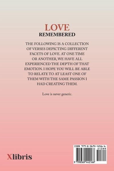 LOVE REMEMBERED THE FOLLOWING IS A COLLECTION OF VERSES DEPICTING DIFFERENT FACETS OF LOVE. AT ONE TIME OR ANOTHER, WE HAVE ALL EXPERIENCED THE DEPTH OF THAT EMOTION. I HOPE YOU WILL BE ABLE TO RELATE TO AT LEAST ONE OF THEM WITH THE SAME PASSION I HAD CREATING THEM. Love is never generic.