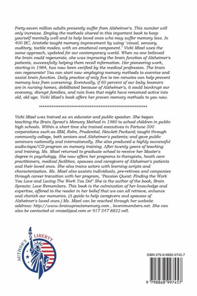 Vicki Mizel, a Master in Psychology, was trained as an educator and public speaker. She began teaching the Brain Sprout's Memory Method in 1980 to school children in public high schools. Within a short time she trained executives in Fortune 500 corporations such as IBM, Rolm, Prudential, Hewlett Packard; taught through community college, both seniors and Alzheimer's patients; and gave public seminars nationally and internationally. She also produced a highly successful audio-tape/CD program on memory training. After 20 years of teaching and training, Mizel returned to graduate school to receive her Master's degree in psychology. She now off ers her programs to therapists, heath care practitioners, medical facilities, spouses and caregivers of Alzheimer's patients and their loved ones. This book is the culmination of her knowledge and expertise, offered to the reader in her belief that we can all retrieve, enhance and cherish our memories. (A guide to help caregivers and spouses of Alzheimer's loved ones.)