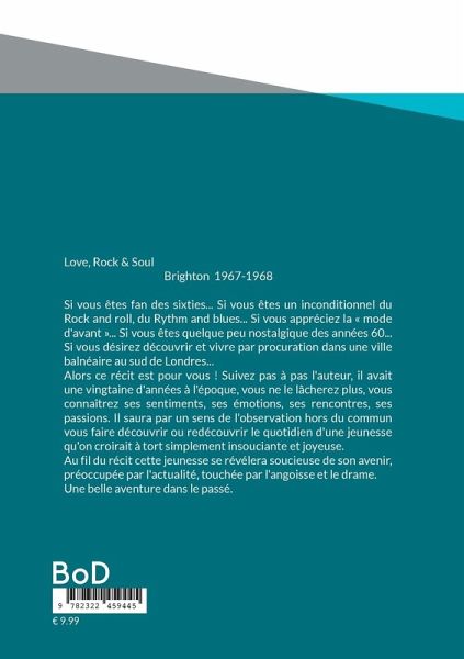 Love, Rock & Soul Brighton 1967-1968Si vous êtes fan des sixties... Si vous êtes un inconditionnel du Rock and roll, du Rythm and blues... Si vous appréciez la « mode d'avant »... Si vous êtes quelque peu nostalgique des années 60... Si vous désirez découvrir et vivre par procuration dans une ville balnéaire au sud de Londres...Alors ce récit est pour vous ! Suivez pas à pas l'auteur, il avait une vingtaine d'années à l'époque, vous ne le lâcherez plus, vous connaîtrez ses sentiments, ses émotions, ses rencontres, ses passions. Il saura par un sens de l'observation hors du commun vous faire découvrir ou redécouvrir le quotidien d'une jeunesse qu'on croirait à tort simplement insouciante et joyeuse.Au fil du récit cette jeunesse se révélera soucieuse de son avenir, préoccupée par l'actualité, touchée par l'angoisse et le drame.Une belle aventure dans le passé.
