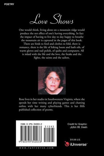 One would think, living alone on a mountain ridge would produce the net effect of one's having everything. In fact the impact of having to live day to day happy to breathe the mountain air is captured in the pages of this book. There are birds to feed and clothes to fold, there is romance, there is the life of hiking boots and bath oils, of warm gloves and nail polish, of quilts and computers. All is inlaid with the life and the love, the freaks and the fights, the saints and the sailors.