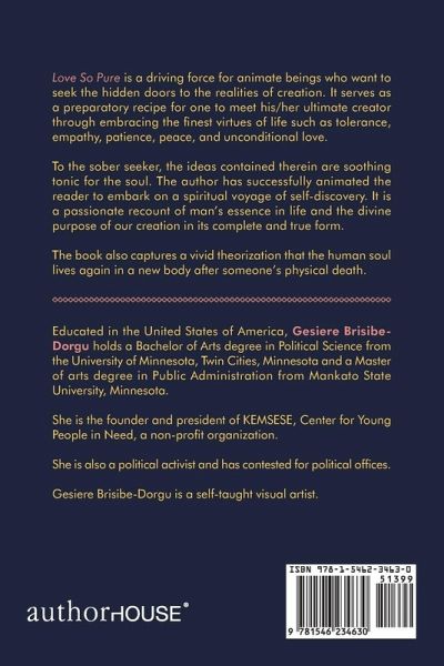 Love So Pure is a driving force for animate beings who want to seek the hidden doors to the realities of creation. It serves as a preparatory recipe for one to meet his/her ultimate creator through embracing the finest virtues of life such as tolerance, empathy, patience, peace, and unconditional love. To the sober seeker, the ideas contained therein are soothing tonic for the soul. The author has successfully animated the reader to embark on a spiritual voyage of self-discovery. It is a passionate recount of mans essence in life and the divine purpose of our creation in its complete and true form. The book also captures a vivid theorization that the human soul lives again in a new body after someones physical death.