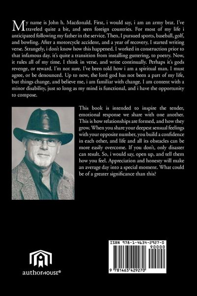 This book is intended to inspire the tender, emotional response we share with one another. This is how relationships are formed, and how they grow. When you share your deepest sensual feelings with your opposite number, you build a confidence in each other, and life and all its obstacles can be more easily overcome. If you don't, only disaster can result. So, i would say, open up, and tell them how you feel. Appreciation and honesty will make an average day into a special moment. What could be of a greater significance than this?