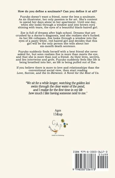Fuyuko never knew love doesn't show up the same way for everyone and that it can take as many forms as dreams themselves... until Zoe crashes through her walls and into her life. When Zoe finds herself with a terminal diagnosis, she decides that she will make a simple bucket list, and she will not tell her best friends she is dying so they will not treat her differently. But this leaves Zoe with the problem of who will help with her bucket list. Fuyuko's life has fallen so deep into a pattern that she doesn't know she has even fallen. When a young woman named Zoe, who she doesn't know, informs her that she is dying. Fuyuko becomes the one person she trusts with her secret as her new friend, even though Fuyuko doesn't want to. But something deep inside her says to do it, so she does, and just like that, Zoe lifts Fuyuko's life into a life with meaning. What was supposed to be a bucket list adventure of karaoke and horseback riding turns into a love story of platonic soul mates as Fuyuko and Zoe's lives twist together. For the first time Fuyuko feels like her life has meaning, a reason to live. It feels like life is being breathed into her, as it is being pulled out of Zoe. Join the adventure of platonic soul mates in Love, Sorrow, and the In-Between to see that there are many ways to love and to live. (Tropes: Found family, bucket list, soul mates, grumpy sunshine, slice of life, one bed.) Trigger Warnings: This story contains subjects of bullying, abandonment, homophobia (specifically: Lesbophobia), and suicide. I like my readers to be well-informed of such topics ahead of time, because your well-being is worth more than my novel.