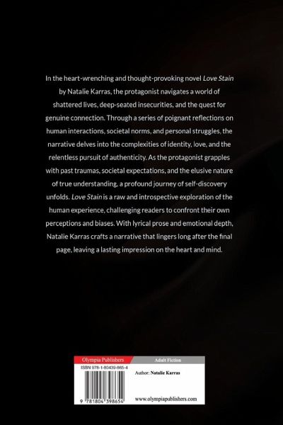 In the heart-wrenching and thought-provoking novel Love Stain by Natalie Karras, the protagonist navigates a world of shattered lives, deep-seated insecurities, and the quest for genuine connection. Through a series of poignant reflections on human interactions, societal norms, and personal struggles, the narrative delves into the complexities of identity, love, and the relentless pursuit of authenticity. As the protagonist grapples with past traumas, societal expectations, and the elusive nature of true understanding, a profound journey of self-discovery unfolds. Love Stain is a raw and introspective exploration of the human experience, challenging readers to confront their own perceptions and biases. With lyrical prose and emotional depth, Natalie Karras crafts a narrative that lingers long after the final page, leaving a lasting impression on the heart and mind.