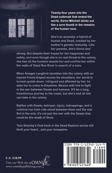 Twenty-four years into the Dead outbreak that ended the world, Soren Mitchell sticks out like a sore thumb in the remains of the human race. She's an anomaly: a hybrid of human and Dead, created by her mother's genetic immunity. Like her parents, she's fierce and strong. But despite their hopes for her happiness and safety, and even though she is no real threat to the colony, she has let the humans muzzle her and confine her within the walls of Dead Run River in search of a cure. When Kaegan Langford stumbles into the colony with an injured friend draped across his shoulders, her world is turned upside down. Intrigued and affected by her, he asks her to come to Empalme, Mexico with him to fight in the war between Deads and humans. It'll be a long, treacherous journey to the coast, but she's had all she can take in the colony. Battles with Deads, betrayal, injury, kidnappings, and a criminal-run train ride stand between them and the war. But in the end, it's not just the war with the Deads that could be the death of them. Tera Shanley's final book in the Dead Rapture series will thrill your heart...and your braaaains.