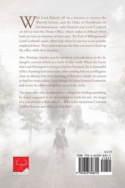 With Lord Blakely off on a mission to recover the Waverly heiress, and the Duke of Hawkhurst on his honeymoon, only Emmett and Lord Cortland are left to man the Home Office, which makes it difficult when both are sent on missions of their own. The Earl of Billingswood, Lord Cortland's uncle, offers help where he can but is not actually employed there. They need someone else they can trust to head up the office while they are away. Mrs. Penelope Smythe uses her position as headmistress at the St. Joseph's convent school as a front for her work. When she learns that Lord Davenport is trying to find her husband, she is distrustful of the charming lord and evades. After sending him on a wild goose chase to distract him from learning of Benedict's death, he returns to find her home ablaze. Even though he's torn between frustration and worry, he offers to help her uncover the truth. The same men who murdered her husband for finding something he wasn't supposed to are determined to finish the job. An image of a coat of arms is their sole clue. Who is the mysterious Crowned Griffon Society, and what are they after?