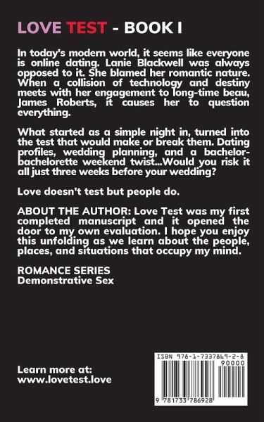 In today's modern world, it seems like everyone is online dating. Lanie Blackwell was always opposed to it, blaming her romantic nature. What do they say about protesting too much? Technology and destiny collide with Lanie's future as her engagement to long-time beau, James Roberts, is tested. What started as a simple night in, turned into a dare that would make or break them. Dating profiles, wedding planning, and a bachelor-bachelorette weekend twist. Would you risk it all just three weeks before your wedding? Love doesn't test but people do.