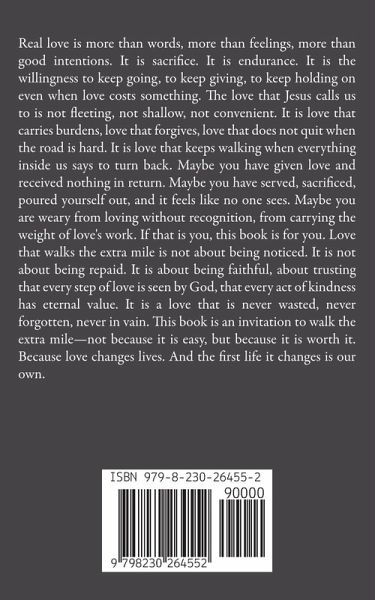 Real love is more than words, more than feelings, more than good intentions. It is sacrifice. It is endurance. It is the willingness to keep going, to keep giving, to keep holding on even when love costs something. The love that Jesus calls us to is not fleeting, not shallow, not convenient. It is love that carries burdens, love that forgives, love that does not quit when the road is hard. It is love that keeps walking when everything inside us says to turn back. Maybe you have given love and received nothing in return. Maybe you have served, sacrificed, poured yourself out, and it feels like no one sees. Maybe you are weary from loving without recognition, from carrying the weight of love's work. If that is you, this book is for you. Love that walks the extra mile is not about being noticed. It is not about being repaid. It is about being faithful, about trusting that every step of love is seen by God, that every act of kindness has eternal value. It is a love that is never wasted, never forgotten, never in vain. This book is an invitation to walk the extra mile-not because it is easy, but because it is worth it. Because love changes lives. And the first life it changes is our own.