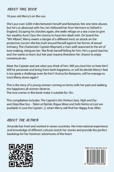 18-year-old Merry's on the run. She's put 3,000 miles between herself and Kempton, her one-time abuser, but he's so obsessed with her, he's followed her from Vermont to Oxford in England. Escaping his clutches again, she seeks refuge on a sea cruise to give her wealthy Aunt Clara the chance to have him dealt with. On board the "MV Albion", Merry meets a danger of a different kind: an attack on the protective cocoon she's built around herself against her horror of sexual intimacy. The charismatic Captain Maynard, a man well-seasoned in the art of love-making, intrigues her. She finds herself falling for him. He's a good teacher, and she wants to learn, but her past trauma threatens her chance to enjoy consensual sex. Meet the Captain and see what you think of him. Will you love him or hate him? Will he persevere and bring them both happiness, or will he decide Merry's fear is too great a challenge even for him? And as for Kempton, will he manage to track Merry down again? This is the story of a young woman coming to terms with her past and seeking the happiness all women deserve. This compilation includes: The Captain's Girl, Perilous Seas, High and Dry and Deep Blue Sea. The last three books in the series, Taken at Riptide, Rogue Wave and Safe Harbor at Last, are available in Love the Captain : 2, when Merry will find her Happy Ever After. (The love scenes in this book make it suitable for 18+.)