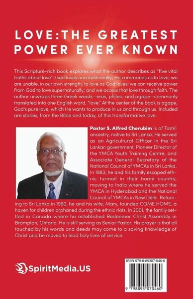 This Scripture-rich book explores what Pastor Alfred Cherubim, describes as, "five vital truths about love": God loves unconditionally; He commands us to love; we are unable, in our own strength, to love as God loves; we can receive empowerment from God to enable us to love supernaturally; and we are able to access that love through faith in the Savior Jesus Christ. The author maintains that each person's greatest need is to love and be loved, and he unwraps for the reader the distinctions in three Greek words translated into the one English word "love." Cited are: eros, sensual desire; phileo, love for an individual deemed worthy of love; and agape, God's love, the purest, deepest love expressed, not merely through emotions, but through an act of one's will. The author then centers the book around the Bible's love chapter, 1 Corinthians 13, and agape, the supernatural, unconditional love, supremely revealed through Jesus's death on the cross for our sins. This love, the author asserts, is the love the Lord wants to produce in us and through us to others by His Holy Spirit. This agape love is given, he contends because of the character of the person loving rather than because of the worthiness of the object of that love. Sometimes it is love "in spite of" rather than "because of." Pastor Alfred argues that individuals can only be moved to live in and share agape love when in relationship with the living God, Jesus Christ. He illustrates the nature of this love through stories drawn from the Bible {The Parable of the Prodigal Son) and from his own personal experience: a hospitalized child reenergized for life through the agape love of a teacher, a man filled with hatred toward everything and everyone who was transformed by agape love.