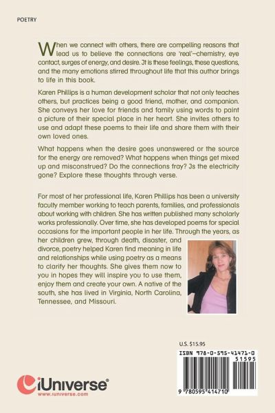When we connect with others, there are compelling reasons that lead us to believe the connections are 'real'- chemistry, eye contact, surges of energy and desire. It is these feelings, these questions, and the many emotions stirred throughout life that this author brings to life in this book. Karen Phillips is a human development scholar that not only teaches others, but practices being a good friend, mother, and companion. She conveys her love for friends and family using words to paint a picture of their special place in her heart. She invites others to use and adapt these poems to their life and share them with their own loved ones. What happens when the desire goes unanswered or the source for the energy are removed? What happens when things get mixed up and misconstrued? Do the connections fray? Is the electricity gone? Explore these thoughts through verse.