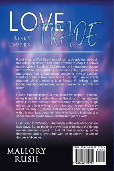 Dangerous Rescue Leads to Love and Desire in Love Trade, a High-Stakes Contemporary Romance by Mallory Rush Las Vegas, 1995 and the country of Zebedique Rand Slick, a Wall Street mogul with a deeply buried past, has a missing sister to find and a promise to keep. He knows exactly where Sarah is: Zebedique, an international haven for the White Slave Trade. His contacts in high places have guaranteed him a seat at an upcoming private auction. Rand can easily take care of the unlimited line of credit required. What's missing is a female PI willing to be kidnapped, stripped and auctioned to make contact with his sister. Rachel Tinsdale is only 23, the ink still wet on her PI license, when Rand Slick walks through the door of her low-rent office. He's a smooth operator with some dangerously rough edges...and he is willing to pay a handsome sum. He's way out of her league, just as Rand knows she could really mess with the man he's become-one who has the instincts of a shark, the ethics of a snake, and the hunger of a wolf. Purchased for $2 million, Rachel plays the role of concubine love slave. But as the time draws near to execute the daring rescue, neither expect to find all that is missing within themselves and a love affair with an explosive mixture of danger and desire. Risky Lovers Series Love Trade Love Lessons Love Game
