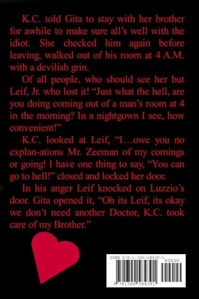 K.C. told Gita to stay with her brother for awhile to make sure all's well with the idiot. She checked him again before leaving, walked out of his room at 4 A.M. with a devilish grin. Of all times, who should see her but Leif, Jr. who lost it! "Just what the hell, are you doing com-ing out of a man's room at 4 in the morning? In a nightgown I see, how convenient!" K.C. looked at Leif, "I...owe you no explan-ations of my comings or going! I have one thing to say, "Go to hell!" walked to her room, locked the door. In his anger Leif knocked on Luzzio's door. Gita opened it, "Oh its Leif, its okay we don't need ano-ther Doctor, K.C. took care of my brother." Leif's in a daze at what he just heard, "What's wrong Gita?" she explained Luzzio had an allergic reaction to the shell fish. He wondered how to get K.C. to forgive him for jumping to a wrong conclu-sion. He knocked on her door, she wouldn't answer...