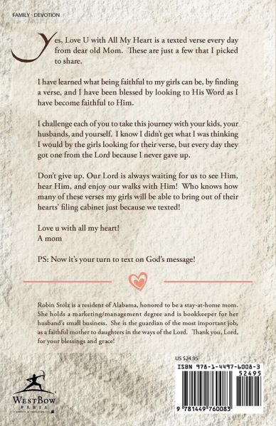 Yes, Love U with All My Heart is a texted verse every day from dear old Mom. These are just a few that I picked to share. I have learned what being faithful to my girls can be, by finding a verse, and I have been blessed by looking to His Word as I have become faithful to Him. I challenge each of you to take this journey with your kids, your husbands, and yourself. I know I didn’t get what I was thinking I would by the girls looking for their verse, but every day they got one from the Lord because I never gave up. Don’t give up. Our Lord is always waiting for us to see Him, hear Him, and enjoy our walks with Him! Who knows how many of these verses my girls will be able to bring out of their hearts’ filing cabinet just because we texted! Love u with all my heart! A mom PS: Now it’s your turn to text on God’s message!