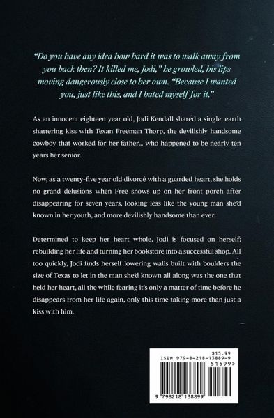 As an innocent eighteen-year-old, Jodi Kendall shared a single, earth-shattering kiss with Texan Freeman Thorp, the devilshly handsome cowboy that worked for her father... who happened to be nearly ten years her senior. Now, as a twenty-five-year-old divorcee with a guarded heart, she holds no grand delusions when Free shows up on her front porch after disappearing for seven years, looking less like the young man she'd known in her youth, and more devilishly handsome than ever. Determined to keep her heart whole, Jodi is focused on herself; rebuilding her life and turning her bookstore into a successful shop. All too quickly, Jodi finds herself lowering walls built with boulders the size of Texas to let in the man that she'd known all along was the one that held her heart, all the while fearing it's only a matter of time before he disappears from her life again, only this time taking more than just a kiss with him.