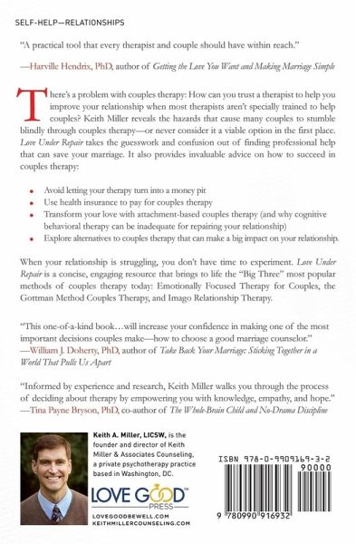 There's a problem with couples therapy: How can you trust a therapist to help you improve your relationship when most therapists aren't specially trained to help couples? Keith Miller reveals the hazards that cause many couples to stumble blindly through couples therapy-or never consider it a viable option in the first place. Love Under Repair takes the guesswork and confusion out of finding professional help that can save your marriage. It also provides invaluable advice on how to succeed in couples therapy: Love Under Repair takes the guesswork and confusion out of finding professional help that can save your marriage. It also provides invaluable advice about succeeding in couples therapy, including how to: -Avoid letting your therapy turn into a money pit -Use health insurance to pay for couples therapy -Transform your love with attachment-based couples therapy (and why cognitive behavioral therapy can be inadequate for repairing your relationship) -Explore alternatives to couples therapy that can make a big impact on your relationship. When your relationship is struggling, you don't have time to experiment. Love Under Repair is a concise, engaging resource that brings to life the "Big Three" most popular methods of couples therapy today: Emotionally Focused Therapy for Couples, the Gottman Method Couples Therapy, and Imago Relationship Therapy.