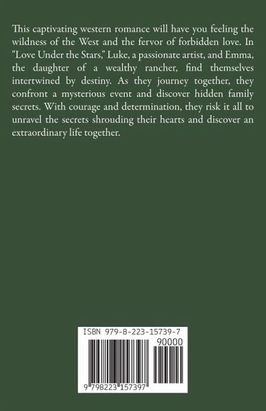 This captivating western romance will have you feeling the wildness of the West and the fervor of forbidden love. In "Love Under the Stars," Luke, a passionate artist, and Emma, the daughter of a wealthy rancher, find themselves intertwined by destiny. As they journey together, they confront a mysterious event and discover hidden family secrets. With courage and determination, they risk it all to unravel the secrets shrouding their hearts and discover an extraordinary life together.