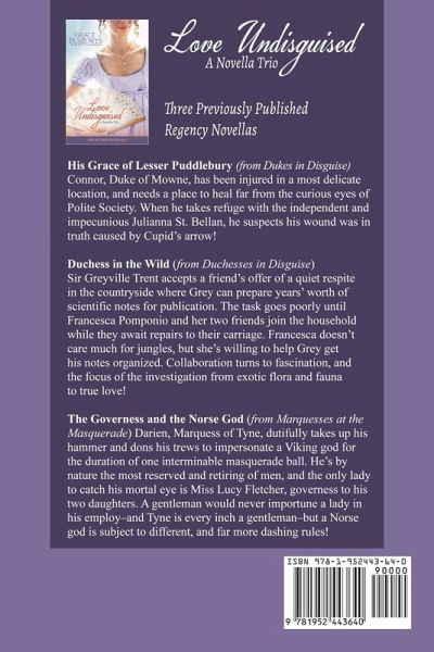 Three PREVIOUSLY PUBLISHED Regency Novellas His Grace of Lesser Puddlebury (from Dukes in Disguise) - Connor, Duke of Mowne, has been injured in a most delicate location, and needs a place to heal far from the curious eyes of Polite Society. When he takes refuge with the independent and impecunious Julianna St. Bellan, he suspects his wound was in truth caused by Cupid's arrow! Duchess in the Wild (from Duchesses in Disguise) - Sir Greyville Trent, Amazon explorer, accepts a friend's offer of a quiet respite in the countryside where Grey can prepare years' worth of scientific notes for publication. The task goes poorly until Francesca Pomponio and her two friends join the household while they await repairs to their carriage. Francesca doesn't care much for jungles, but she's willing to help Grey get his notes organized. Collaboration turns to fascination, and the focus of the investigation from exotic flora and fauna to true love! The Governess and the Norse God (from Marquesses at the Masquerade) - Darien, Marquess of Tyne, dutifully takes up his hammer and dons his trews to impersonate a Viking god for the duration of one interminable masquerade ball. He's by nature the most reserved and retiring of men, and the only lady to catch his mortal eye is Miss Lucy Fletcher, governess to his two daughters. A gentleman would never importune a lady in his employ-and Tyne is every inch a gentleman-but a Norse god is subject to different, and far more dashing rules!