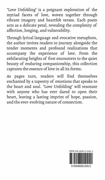 "Love Unfolding" is a poignant exploration of the myriad facets of love, woven together through vibrant imagery and heartfelt verses. Each poem acts as a delicate petal, revealing the complexity of affection, longing, and vulnerability. Through lyrical language and evocative metaphors, the author invites readers to journey alongside the tender moments and profound realizations that accompany the experience of love. From the exhilarating heights of first encounters to the quiet beauty of enduring companionship, this collection captures the essence of love in all its forms. As pages turn, readers will find themselves enchanted by a tapestry of emotions that speaks to the heart and soul. "Love Unfolding" will resonate with anyone who has ever dared to open their heart, leaving a lasting imprint of hope, passion, and the ever-evolving nature of connection.