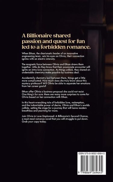 A Billionaire shared passion and quest for fun led to a forbidden romance. When Ethan, the charismatic leader of an innovative engineering team, sets his eyes on Olivia, their connection ignites with an electric intensity. The magnetic force between Olivia and Ethan draws them together. Little do they know that their passionate encounter will ignite an intra-love connection. As things unfold, they shared an undeniable chemistry make possible by business deal. Accidentally chemistry boil between them, things get a little more complicated. How much does she truly know about this mystery professor? Will Olivia be able to separate her emotions from her career goals? Ethan offer Olivia a business proposal she could not resist. One thing's for sure: there are many more surprises to come for Olivia based on her connection with Ethan. In this heart-wrenching tale of forbidden love, redemption, and the indomitable power of desire, Olivia and Ethan's worlds collide, setting the stage for a journey that will leave readers breathless and yearning for more. Join Olivia in Love Unplanned: A Billionaire's Second Chance, a must-read romance novel that you will struggle to put down. Grab your copy today.