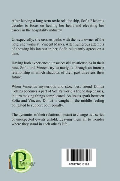 After leaving a long term toxic relationship, Sofia Richards decides to focus on healing her heart and elevating her career in the hospitality industry. Unexpectedly, she crosses paths with the new owner of the hotel she works at, Vincent Marks. After numerous attempts of showing his interest in her, Sofia reluctantly agrees on a date. Having both experienced unsuccessful relationships in their past, Sofia and Vincent try to navigate through an intense relationship in which shadows of their past threatens their future. When Vincent's mysterious and stoic best friend Dmitri Collins becomes a part of Sofia's world a friendship ensues, in turn making things complicated. As issues spark between Sofia and Vincent, Dmitri is caught in the middle feeling obligated to support both equally. The dynamics of their relationship start to change as a series of unexpected events unfold. Leaving them all to wonder where they stand in each other's life. *Explicit Content