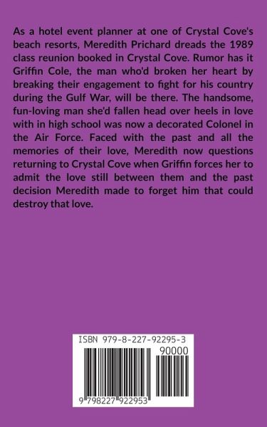 As a hotel event planner at one of Crystal Cove's beach resorts, Meredith Prichard dreads the 1989 class reunion booked in Crystal Cove. Rumor has it Griffin Cole, the man who'd broken her heart by breaking their engagement to fight for his country during the Gulf War, will be there. The handsome, fun-loving man she'd fallen head over heels in love with in high school was now a decorated Colonel in the Air Force. Faced with the past and all the memories of their love, Meredith now questions returning to Crystal Cove when Griffin forces her to admit the love still between them and the past decision Meredith made to forget him that could destroy that love.
