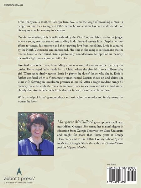 Ernie Tennyson, a southern Georgia farm boy, is on the verge of becoming a man?a dangerous time for a teenager in 1967. Before he knows it, he has been drafted and is on his way to serve his country in Vietnam. On his first mission, he is brutally stabbed by the Viet Cong and left to die in the jungle, where a young woman named Anna Ming finds him and rescues him. Despite her best efforts to conceal his presence and their growing love from her father, Ernie is captured by the North Vietnamese and imprisoned. His time in the camp is so traumatic that he returns home to the United States a profoundly wounded man. Stripped of his memory, the soldier fights to readjust to civilian life. Promised to another man, Anna Ming must now conceal another secret: the baby she carries. Her enraged father sends her to China, where she gives birth to a stillborn baby girl. When Anna finally reaches Ernie by phone, he doesn?t know who she is. Ernie is further confused when a Vietnamese woman named Laquan shows up and claims she is his wife, forming an unwelcome presence in his life. After a tragic accident brings his memory back, he sends the romantic imposter back to Vietnam and tries to find Anna. Shortly after Anna?s father tells Ernie that she is dead, the old man is murdered. With the help of Anna?s grandmother, can Ernie solve the murder and finally marry the woman he loves?