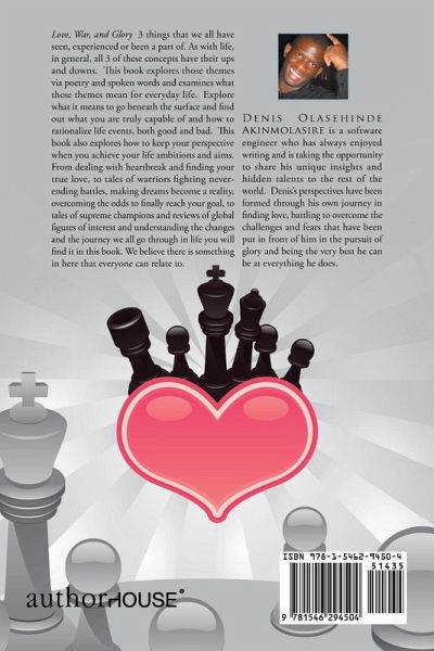 Love, War, and Glory 3 things that we all have seen, experienced or been a part of. As with life, in general, all 3 of these concepts have their ups and downs. This book explores those themes via poetry and spoken words and examines what these themes mean for everyday life. Explore what it means to go beneath the surface and find out what you are truly capable of and how to rationalize life events, both good and bad. This book also explores how to keep your perspective when you achieve your life ambitions and aims. From dealing with heartbreak and finding your true love, to tales of warriors…mehr