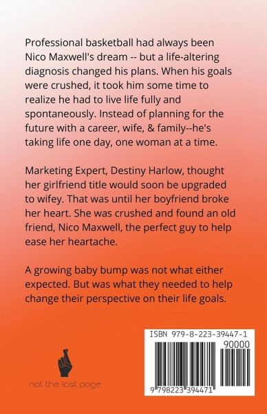 Professional basketball had always been Nico Maxwell's dream -- but a life-altering diagnosis changed his plans. When his goals were crushed, it took him some time to realize he had to live life fully and spontaneously. Instead of planning for the future with a career, wife, & family--he's taking life one day, one woman at a time. Marketing Expert, Destiny Harlow, thought her girlfriend title would soon be upgraded to wifey. That was until her boyfriend broke her heart. She was crushed and found an old friend, Nico Maxwell, the perfect guy to help ease her heartache. A growing baby bump was not what either expected. But was what they needed to help change their perspective on their life goals.