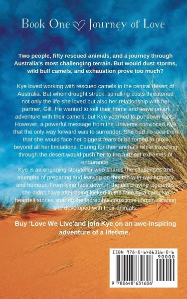 Two people, fifty rescued animals, and a journey through Australia's most challenging terrain. But would dust storms, wild bull camels, and exhaustion prove too much? Kye loved working with rescued camels in the central desert of Australia. But when drought struck, spiralling costs threatened not only the life she loved but also her relationship with her partner, Gill. He wanted to sell their home and leave on an adventure with their camels, but Kye yearned to put down roots. However, a powerful message from the Universe convinced Kye that the only way forward was to surrender. She had no idea then that she would face her biggest fears or be forced to grow beyond all her limitations. Caring for their animals while travelling through the desert would push her to the furthest extremes of endurance. Kye is an engaging storyteller who shares the challenges and triumphs of preparing and leaving on this trip with raw honesty and humour. From lying face down in the dirt craving cigarettes she didn't have after being kicked in the face by a camel to heartfelt stories sharing the incredible conscious communication she developed with their animals. Buy 'Love We Live'and join Kye on an awe-inspiring adventure of a lifetime.