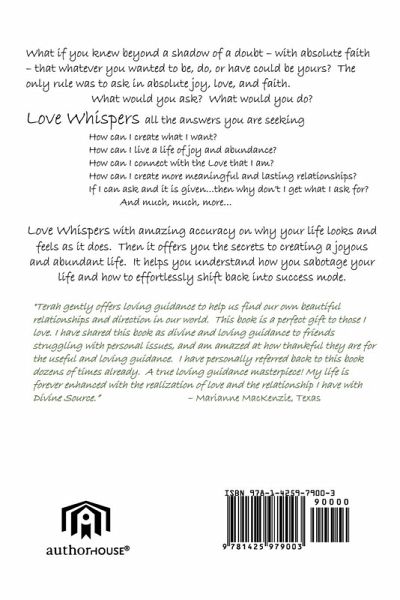What if you knew beyond a shadow of a doubt - with absolute faith - that whatever you wanted to be, do, or have could be yours? The only rule was to ask in absolute joy, love, and faith. What would you ask? What would you do? Love Whispers all the answers you are seeking How can I create what I want? How can I live a life of joy and abundance? How can I connect with the Love that I am? How can I create more meaningful and lasting relationships? If I can ask and it is given.then why don't I get what I ask for? And much, much, more. Love Whispers with amazing accuracy on why your life looks and feels as it does. Then it offers you the secrets to creating a joyous and abundant life. It helps you understand how you sabotage your life and how to effortlessly shift back into success mode. "Terah gently offers loving guidance to help us find our own beautiful relationships and direction in our world. This book is a perfect gift to those I love. I have shared this book as divine and loving guidance to friends struggling with personal issues, and am amazed at how thankful they are for the useful and loving guidance. I have personally referred back to this book dozens of times already. A true loving guidance masterpiece! My life is forever enhanced with the realization of love and the relationship I have with Divine Source." - Marianne MacKenzie, Texas