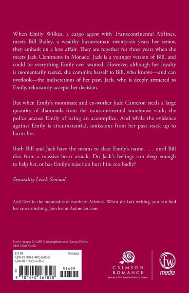 When Emily Wilkes, a cargo agent with Transcontinental Airlines, meets Bill Bailey, a wealthy businessman twenty-six years her senior, they embark on a love affair. They are together for three years when she meets Jack Clemmons in Monaco. Jack is a younger version of Bill, and could be everything Emily ever wanted. However, although her loyalty is momentarily tested, she commits herself to Bill, who knows - and can overlook - the indiscretions of her past. Jack, who is deeply attracted to Emily, reluctantly accepts her decision. But when Emily's roommate and co-worker Jude Cameron steals a large quantity of diamonds from the Transcontinental warehouse vault, the police accuse Emily of being Jude's accomplice. And while the evidence against Emily is circumstantial, omissions from her past stack up to harm her. Both Bill and Jack have the means to clear Emily's name . . . until Bill dies from a massive heart attack. Do Jack's feelings run deep enough to help her, or has Emily's rejection hurt him too badly? Sensuality Level: Sensual